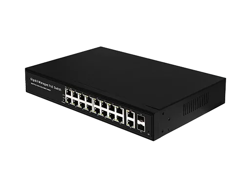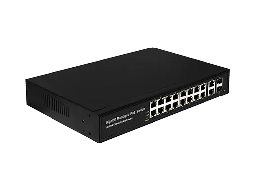 Puerto fijo | 16*10/100/1000M RJ45 PoE Puertos 2*10/100/1000M RJ45 Uplinks 2*1000M SFP |